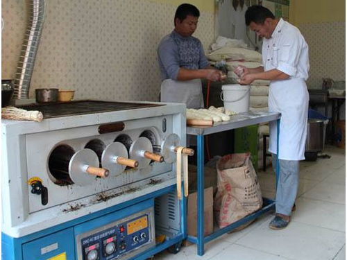 燒烤用小餅爐烤制的小餅主要是供應羊肉串燒烤店使用。將這種小餅刷上甜面醬,卷上烤熟的肉串和小蔥,別有一番風味。燒烤用小餅是發面餅,烤熟后是軟的能卷起來,一斤干面生產約40個,直徑約12cm,當天做餅,當天售出,不存貨,夏天銷量大,冬天銷量少,利潤較高。